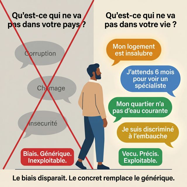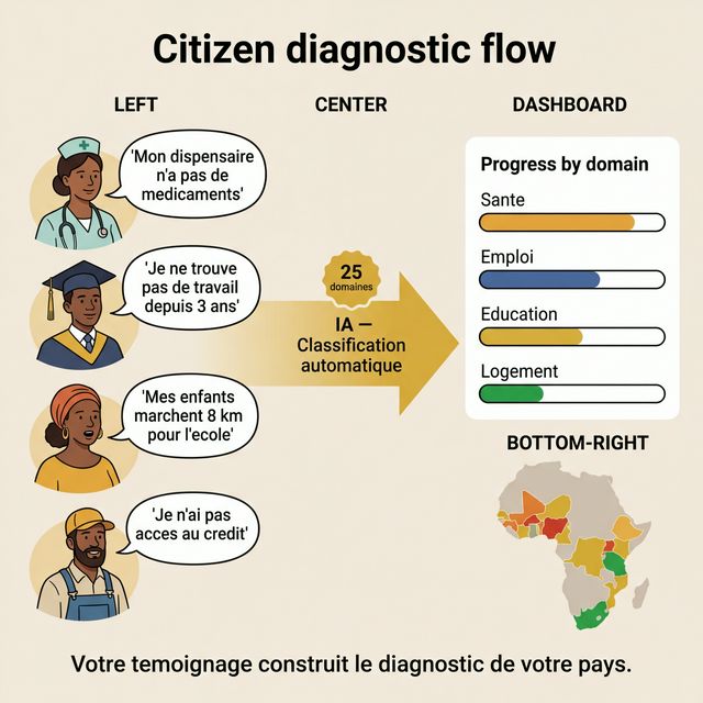 Le projet arrive avec une ambition immense : resoudre les problemes structurels de chaque pays — emploi, education, sante, logement, gouvernance. Mais pour resoudre, il faut d'abord savoir. Et pour savoir, il faut ecouter.
