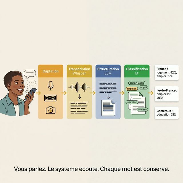 Pas le pays. Votre vie. Sante, emploi, logement, education — racontez votre quotidien, l'IA classe et aggrege. Le diagnostic national se construit temoignage apres temoignage.
