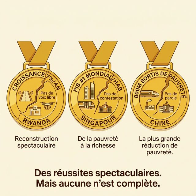 Il serait malhonnete de pretendre que la gouvernance descendante echoue partout. Certains pays obtiennent des résultats spectaculaires — croissance, infrastructures, éducation, santé. Il faut les regarder honnetement. Et il faut comprendre ce qu'ils nous enseignent.