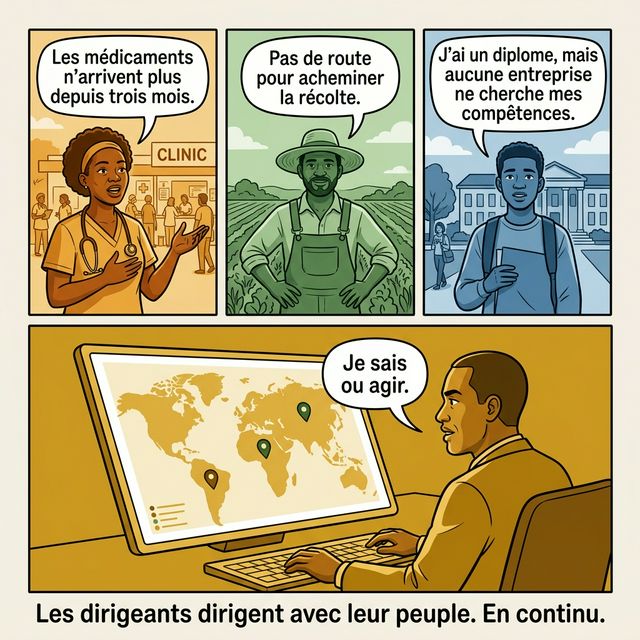 Ces trois voix remontent. En temps reel. Pas dans un rapport statistique de l'an dernier. Maintenant. Le dirigeant les voit sur son tableau de bord. Il sait ou agir. C'est ca, la Gouvernance Ascendante. Les dirigeants continuent a diriger. Mais ils dirigent avec leur peuple, pas a la place de leur peuple.